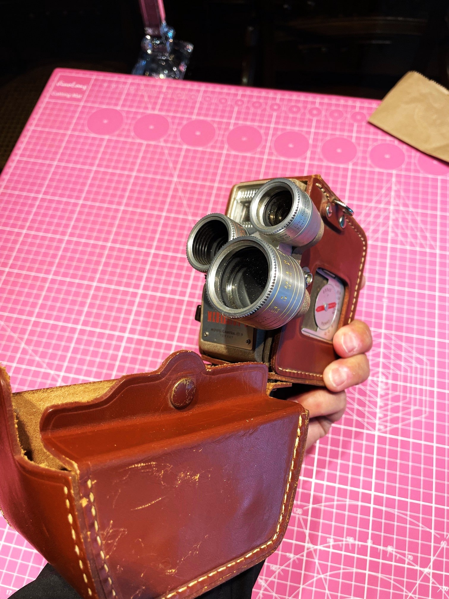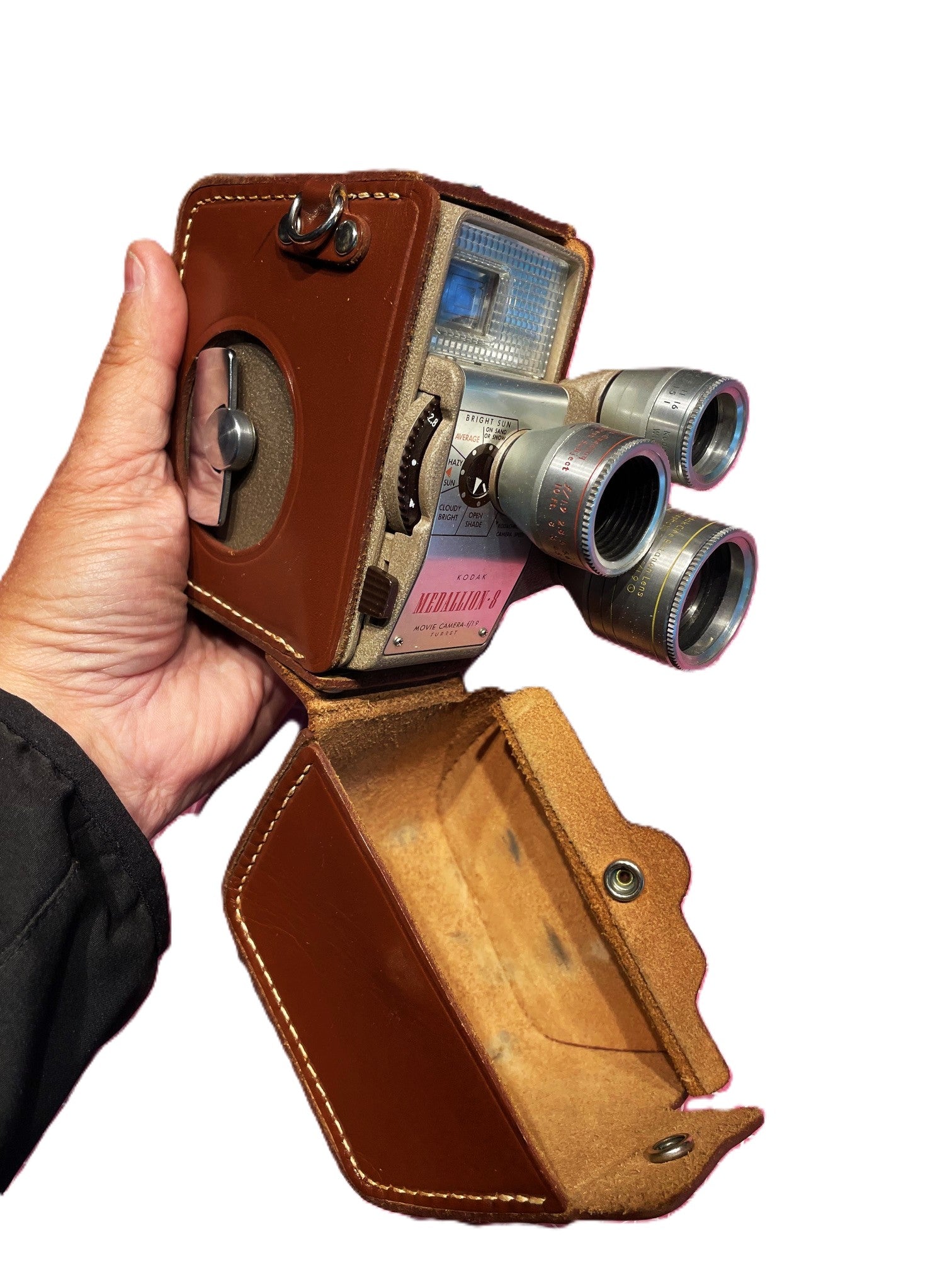 Antigua filmadora 8 mm marca Kodak modelo Medallion con 3 lentes , americana. Muy decorativa, se puede dar cuerda y funciona. Con su estuche de cuero original.