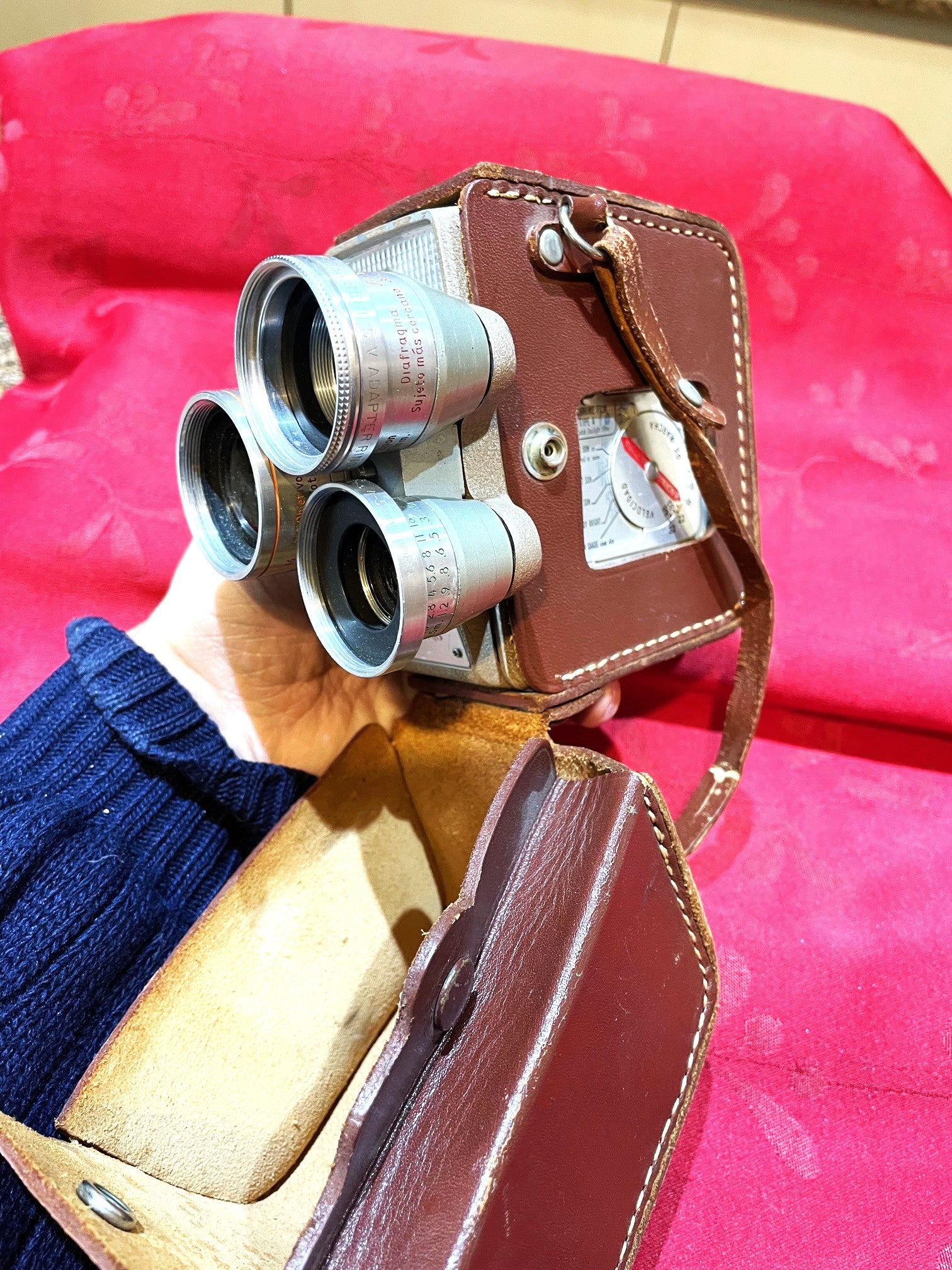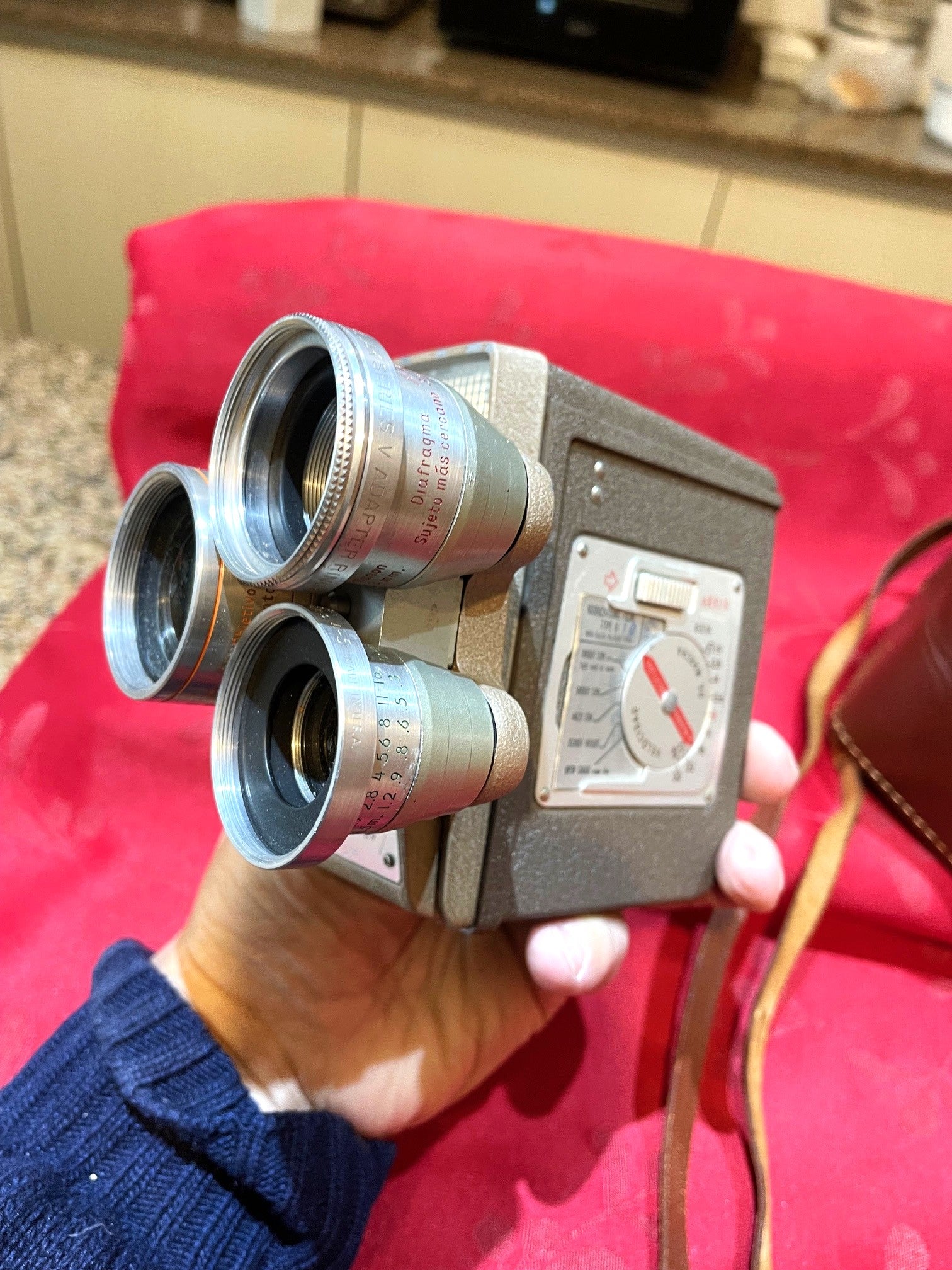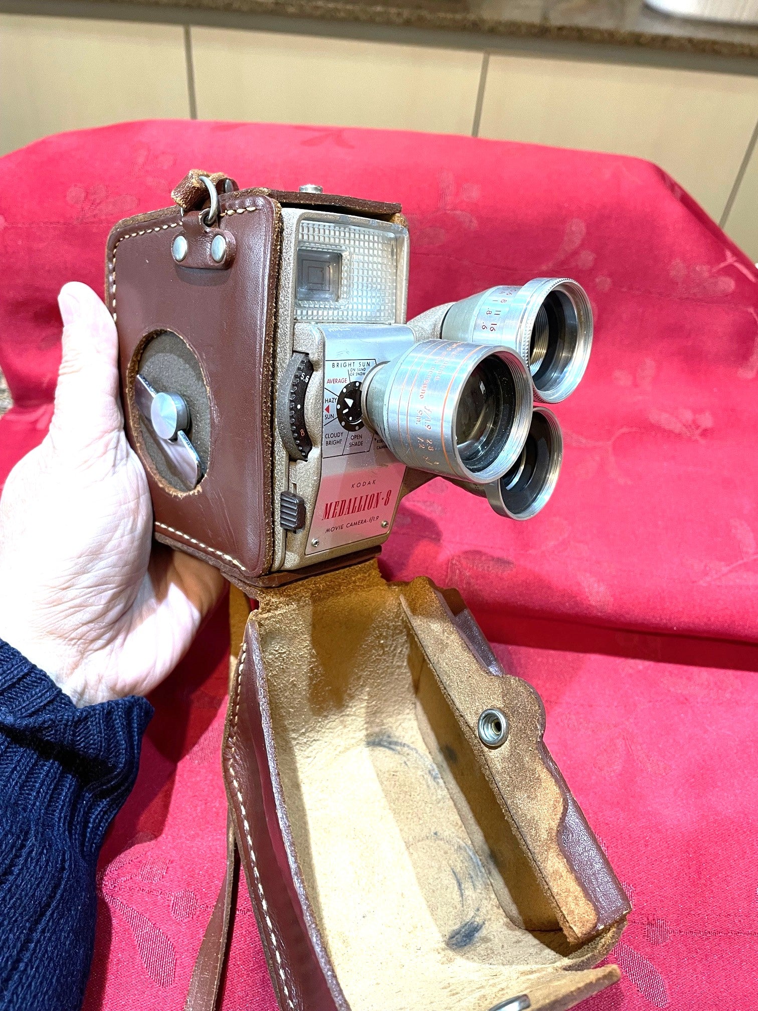 Antigua filmadora 8 mm marca Kodak modelo Medallion con 3 lentes en su estuche de cuero original, americana. Muy decorativa, se puede dar cuerda y funciona