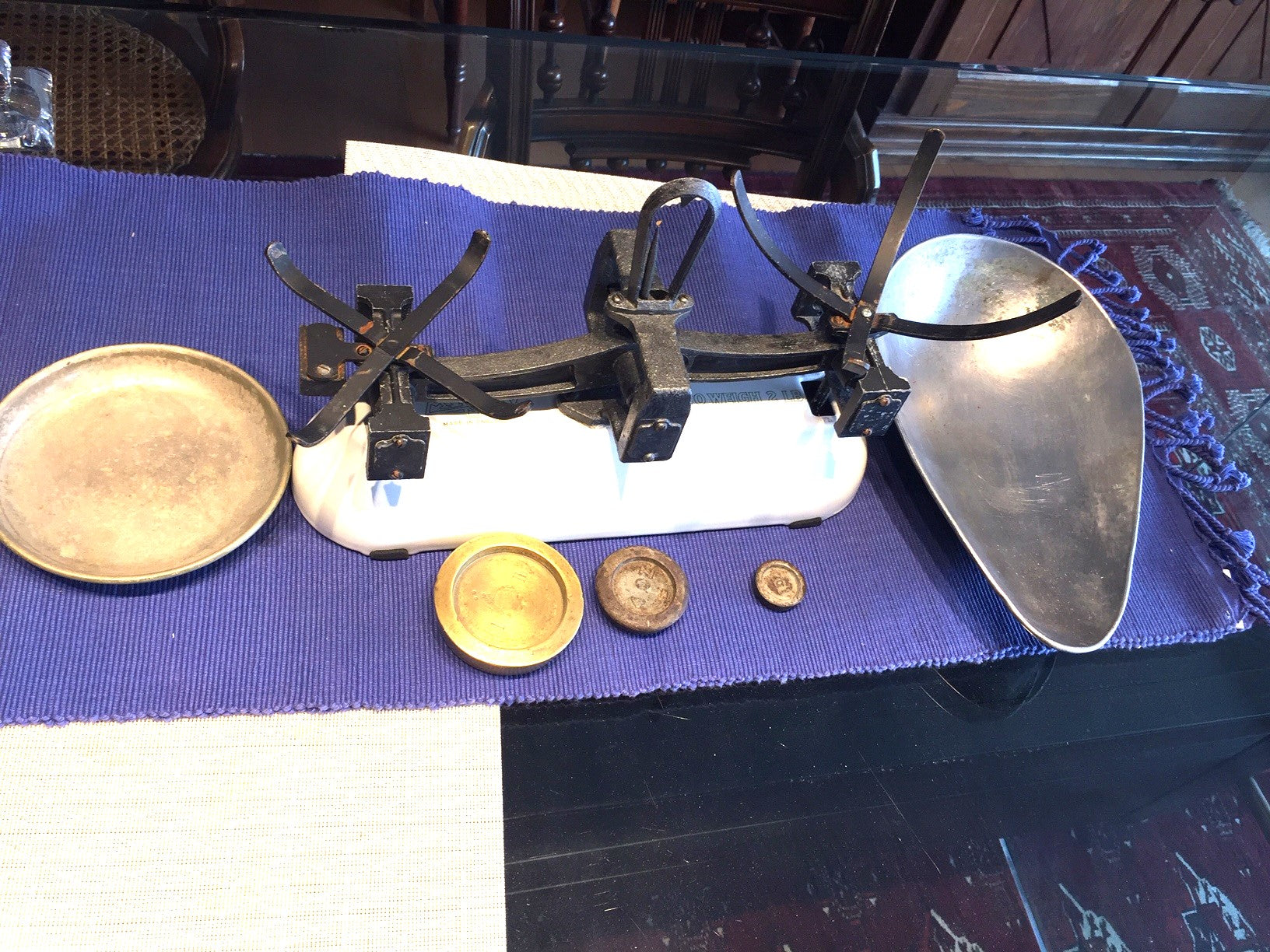 Preciosa Pesa o balanza dulcera inglesa marca Avery enlozada con 3 pesas. Funciona perfectamente. Mide 31 cm de ancho y 20 cm de alto