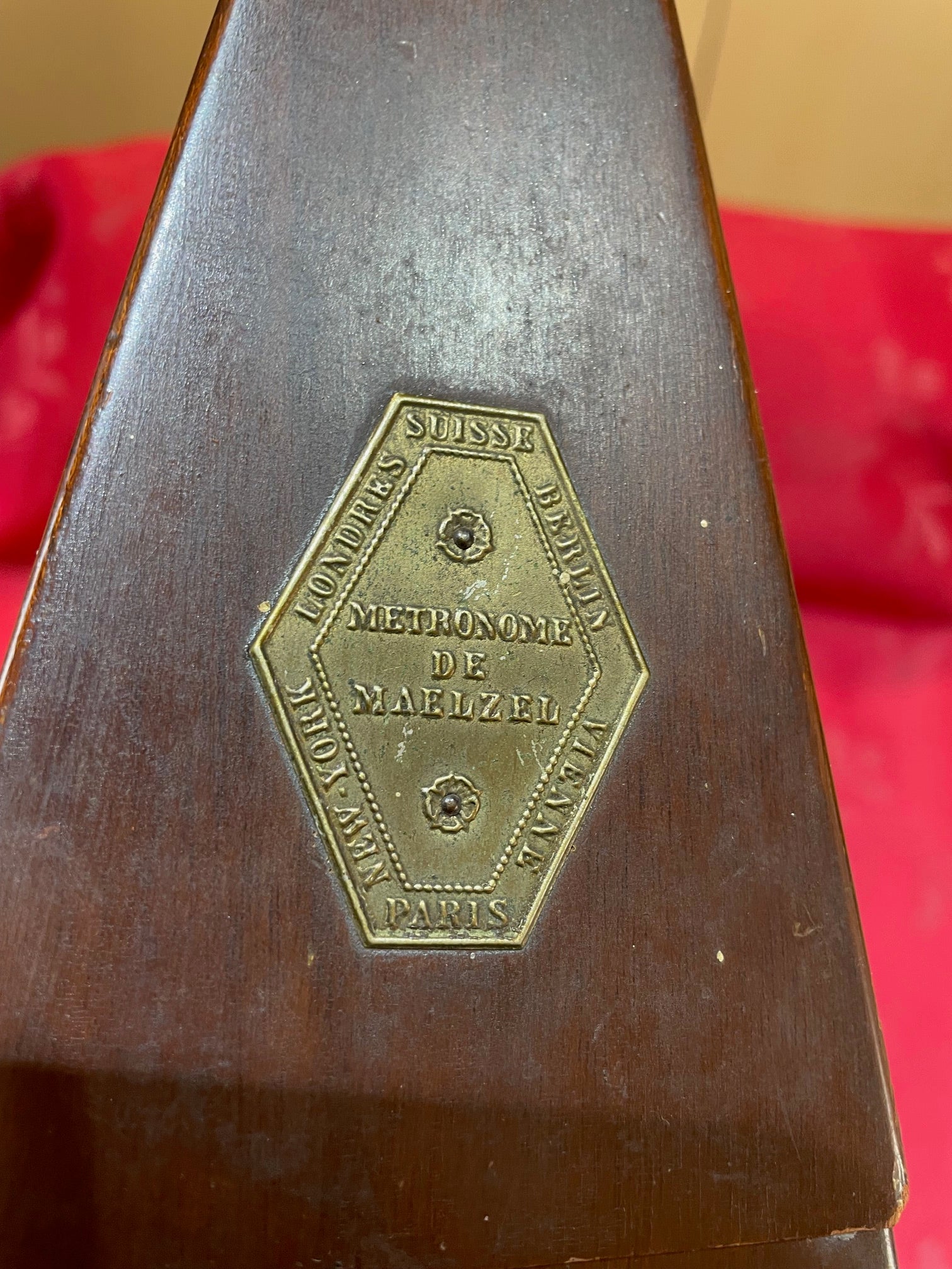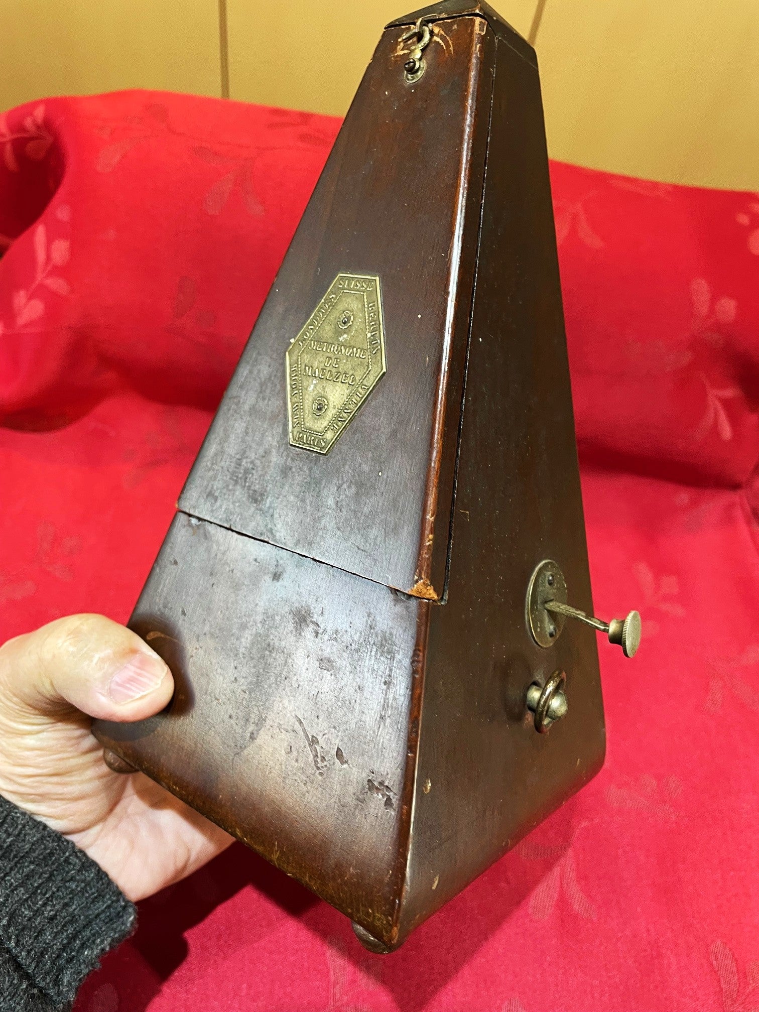 Lindo metrónomo de madera marca Maelzel con campanilla en buen estado, funcionando.