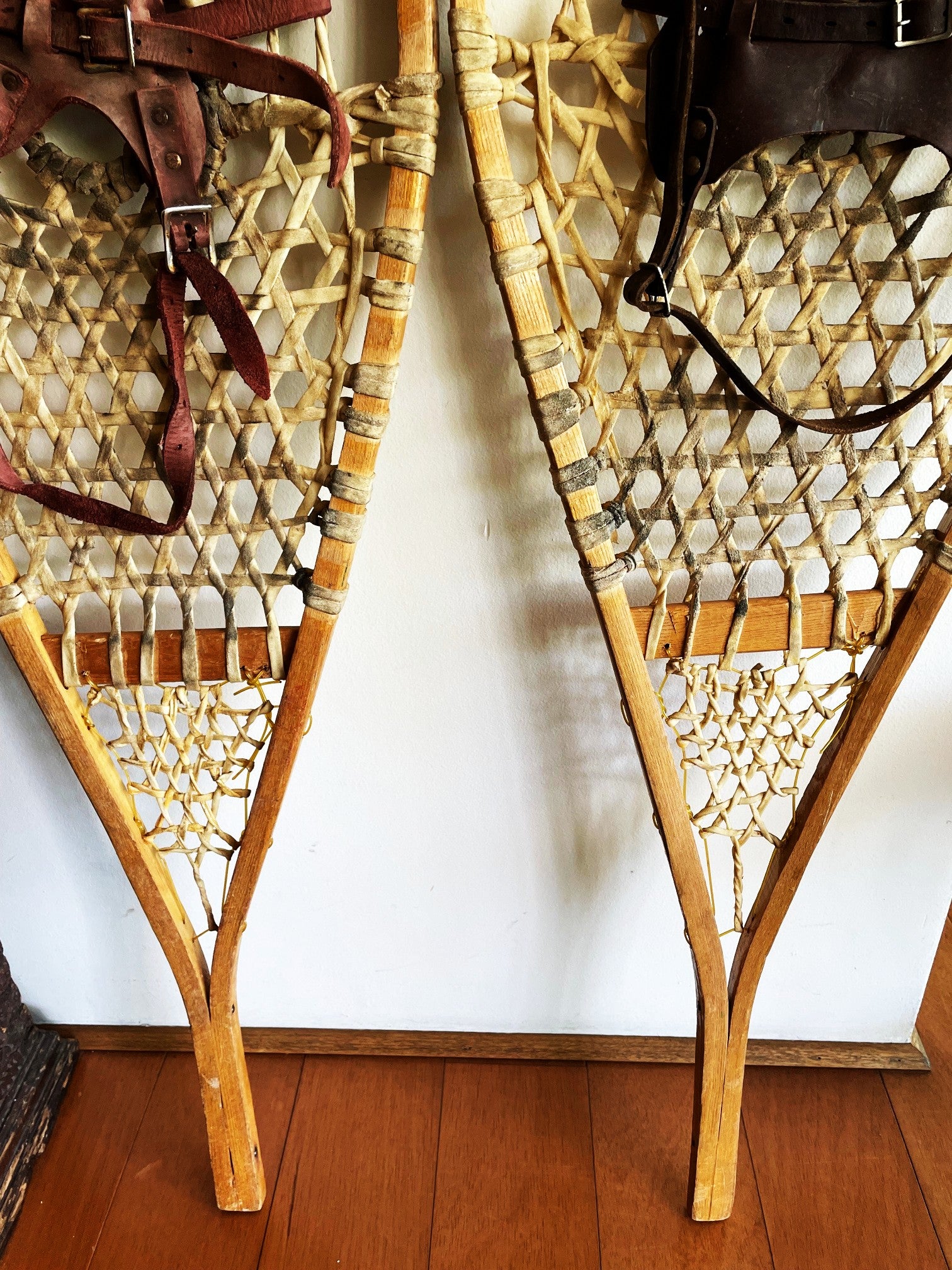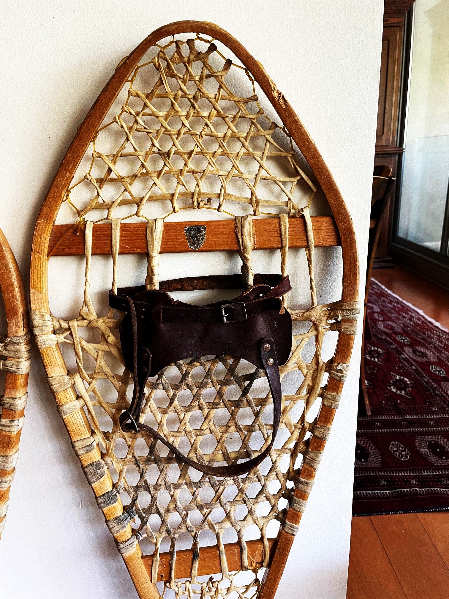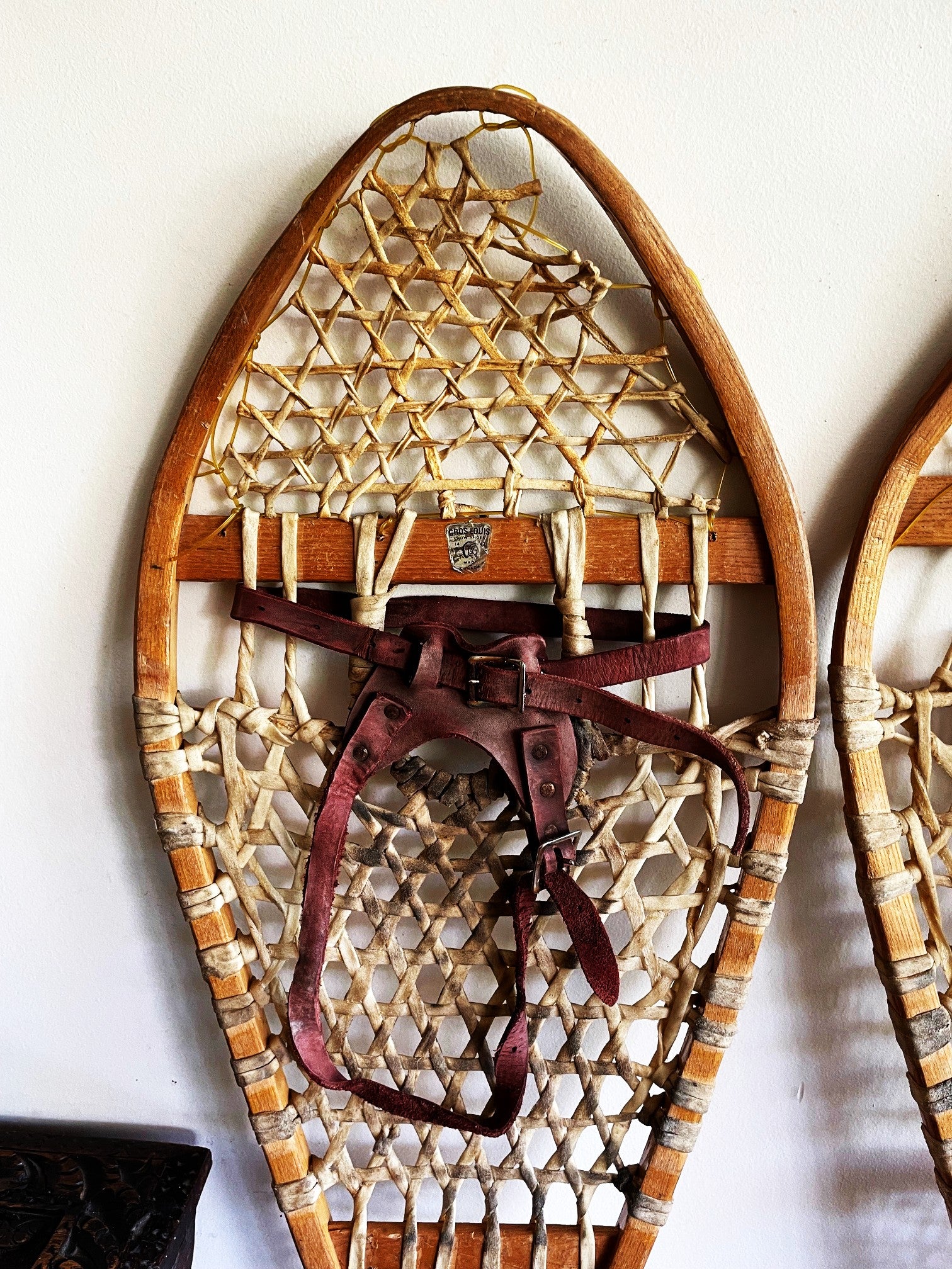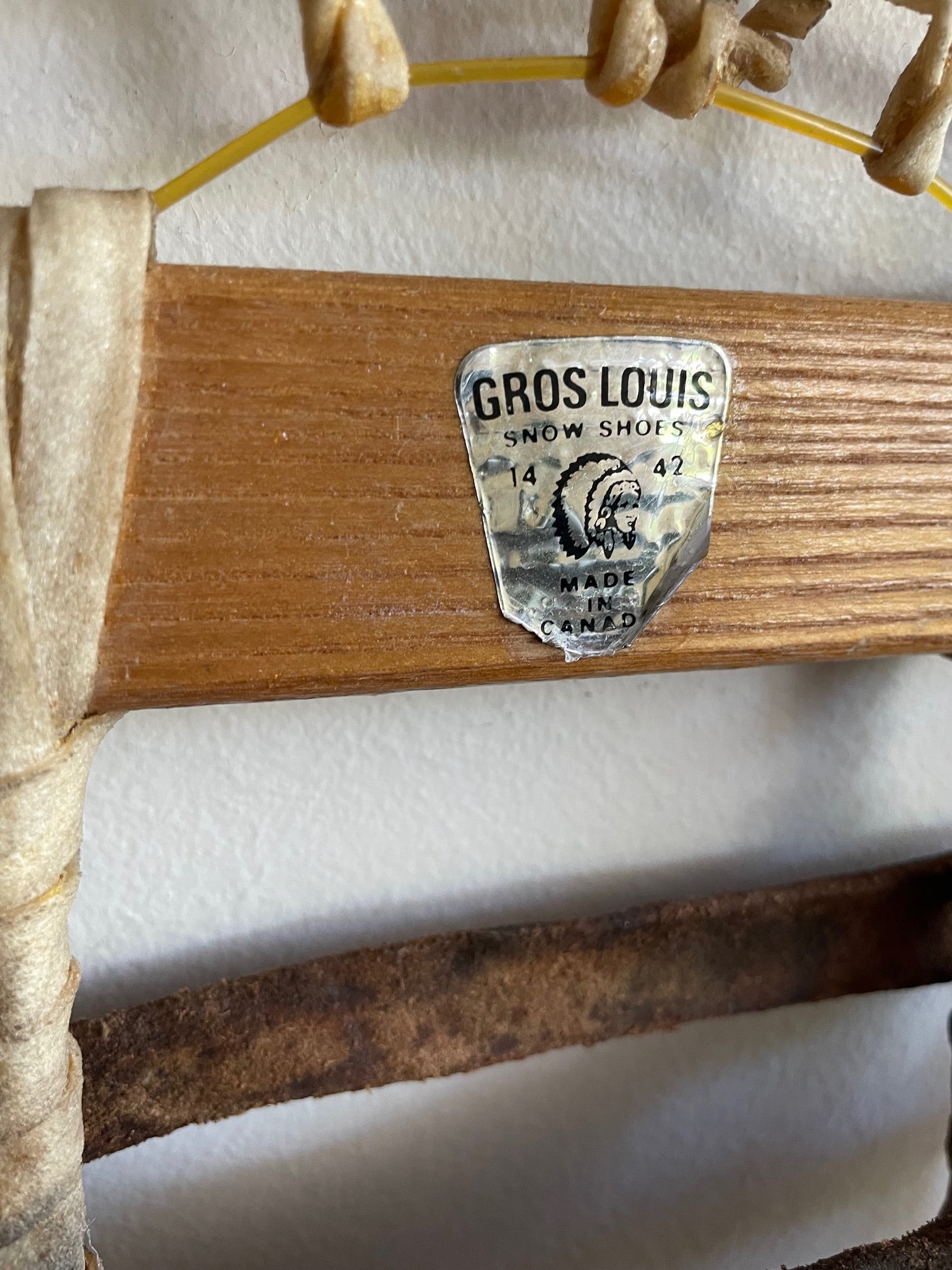 Autenticas raquetas de nieve de madera y cuero canadienses marca Gros Louis. Tienen 107 cm de largo. Super decorativas,