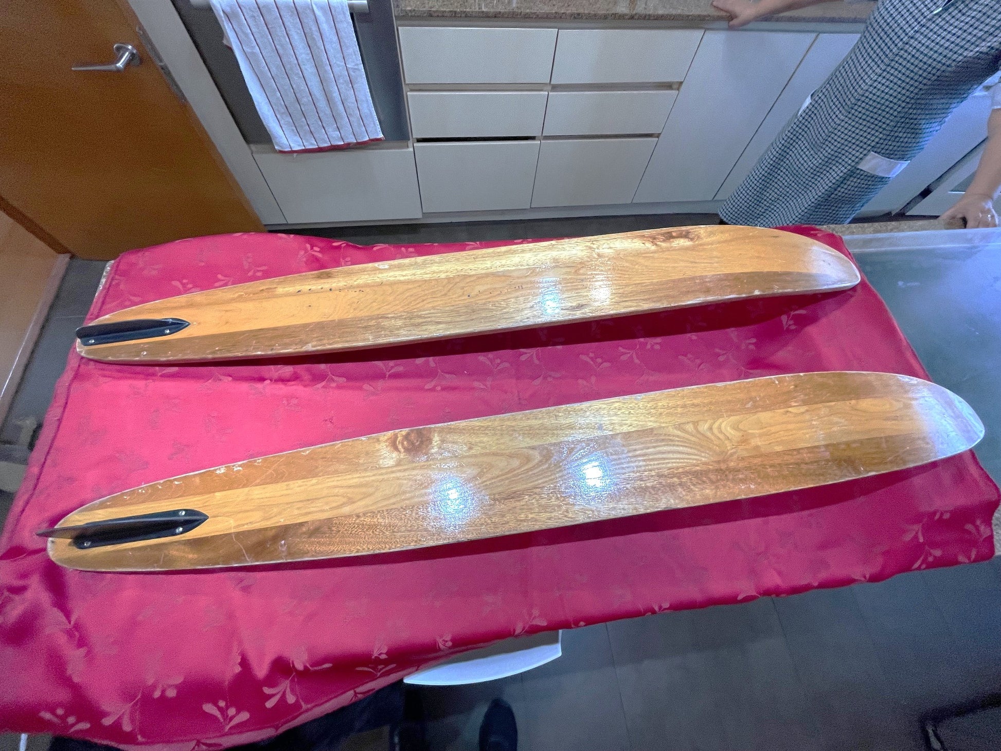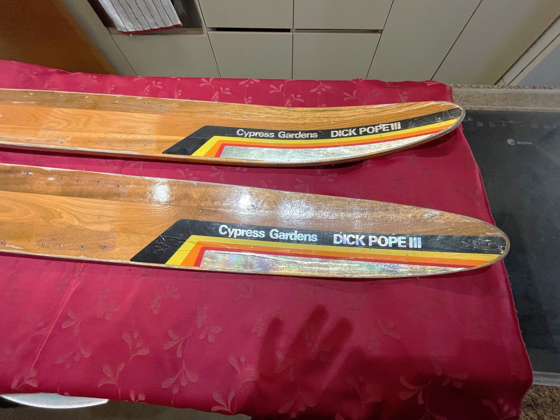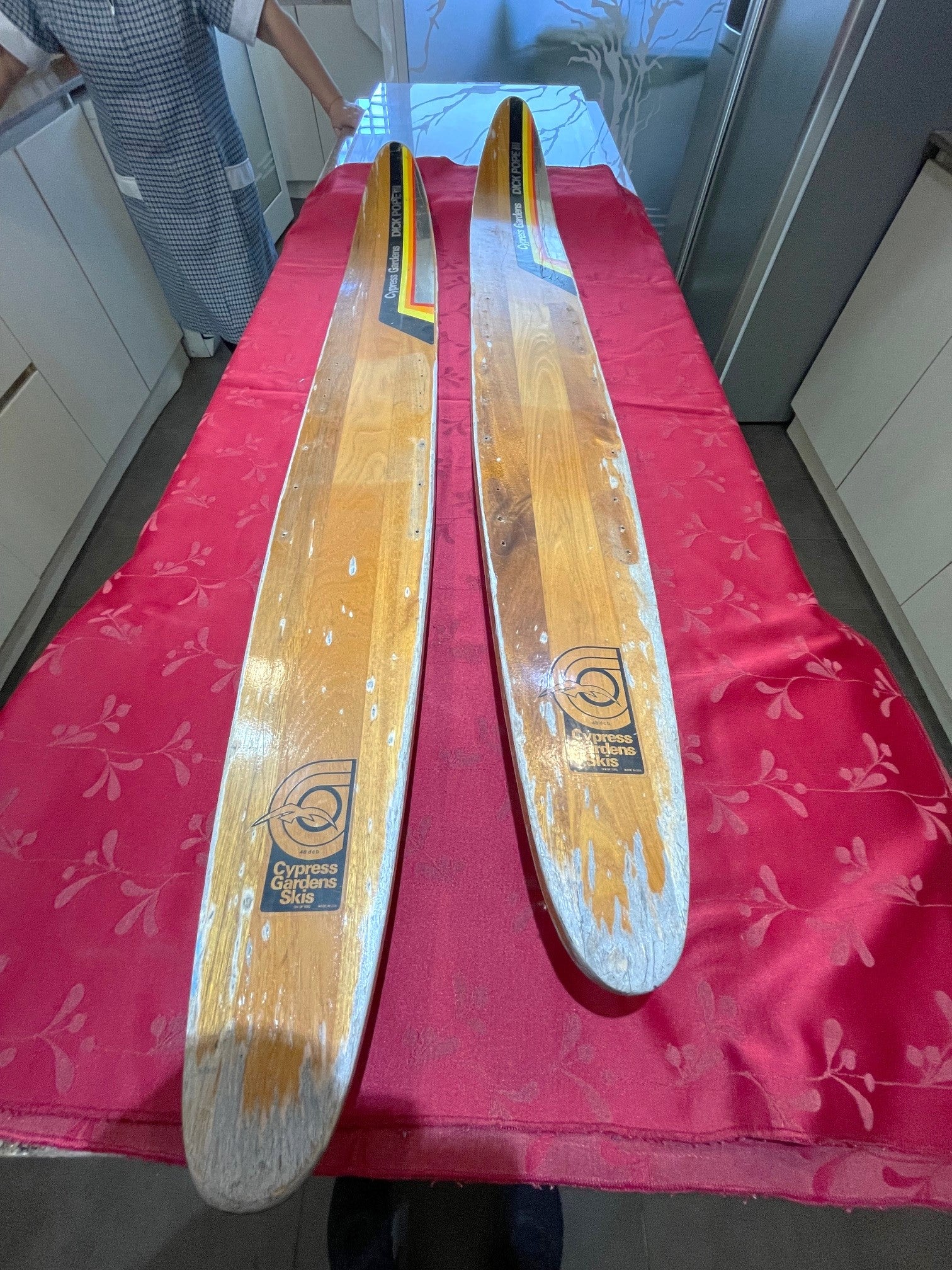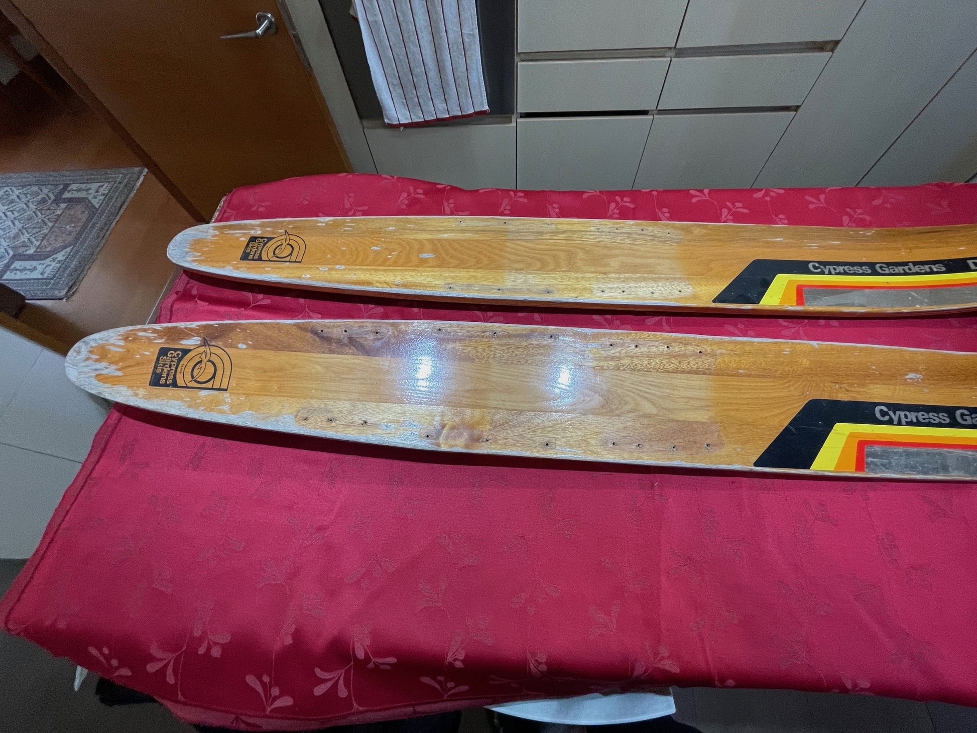 Antiguo par de ski nautico de madera marca Cypress Gardens. Miden 1,42 mta.