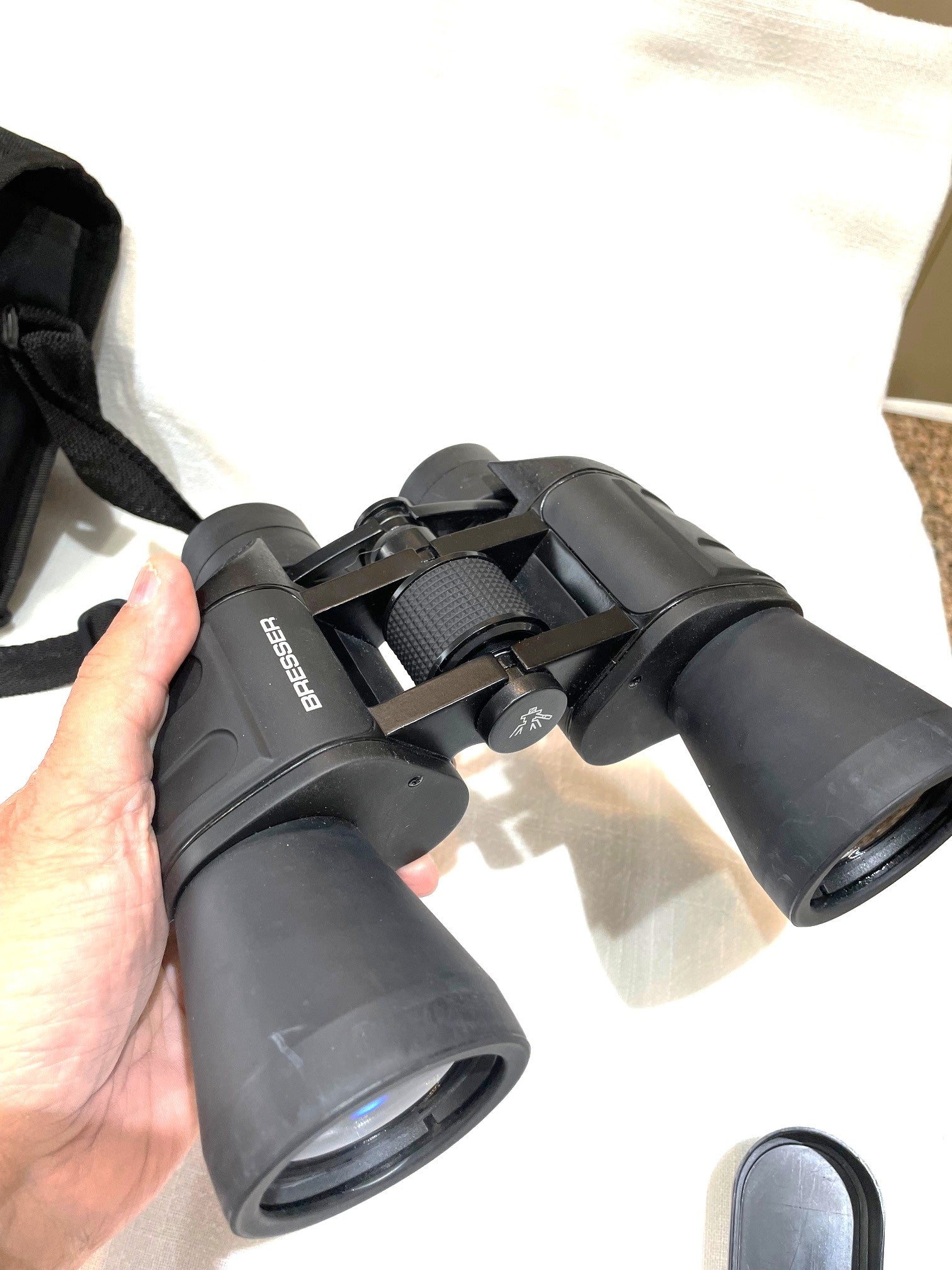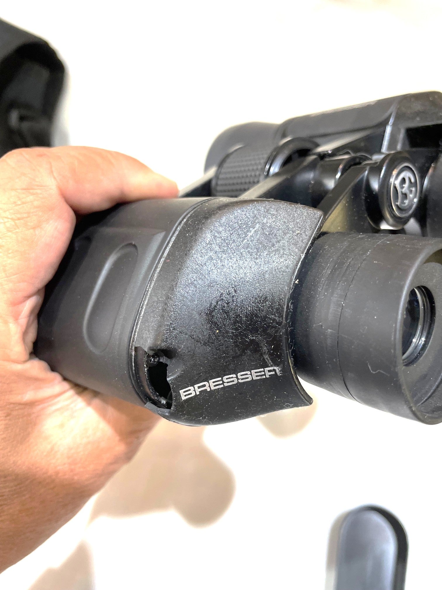 Binoculares BRESSER 10x50 con su estuche original. Tiene una pequeña saltadura en un borde exterior (ver ultima fot0) que no afecta para nada su excelente funcionamiente y nitida vision