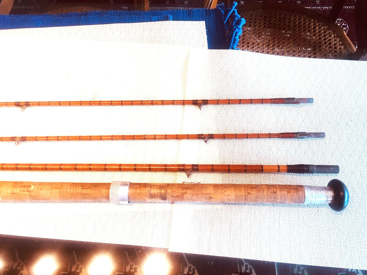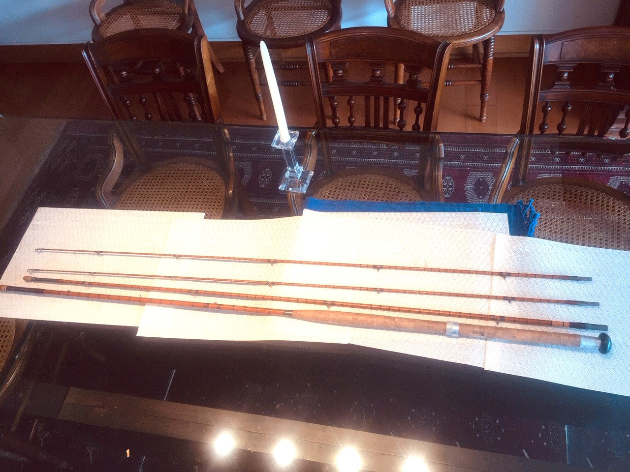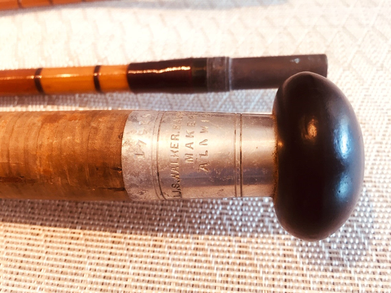 Finísima antigua caña mosquera de bamboo hexagonal marca JSS Walker Bampton, inglesa, en buen estado. Es de 3 secciones con 2 punteras. Mide 3,6 mt.
