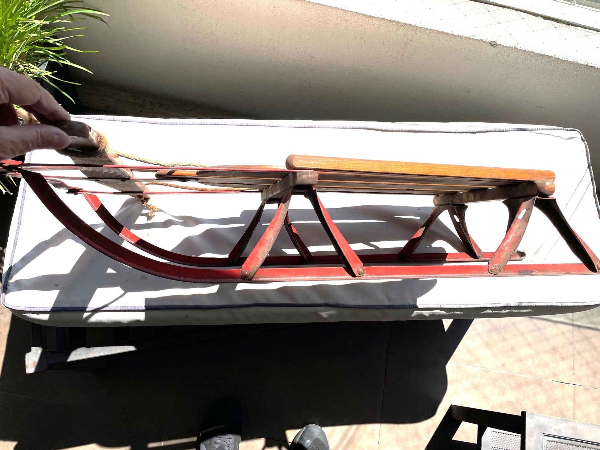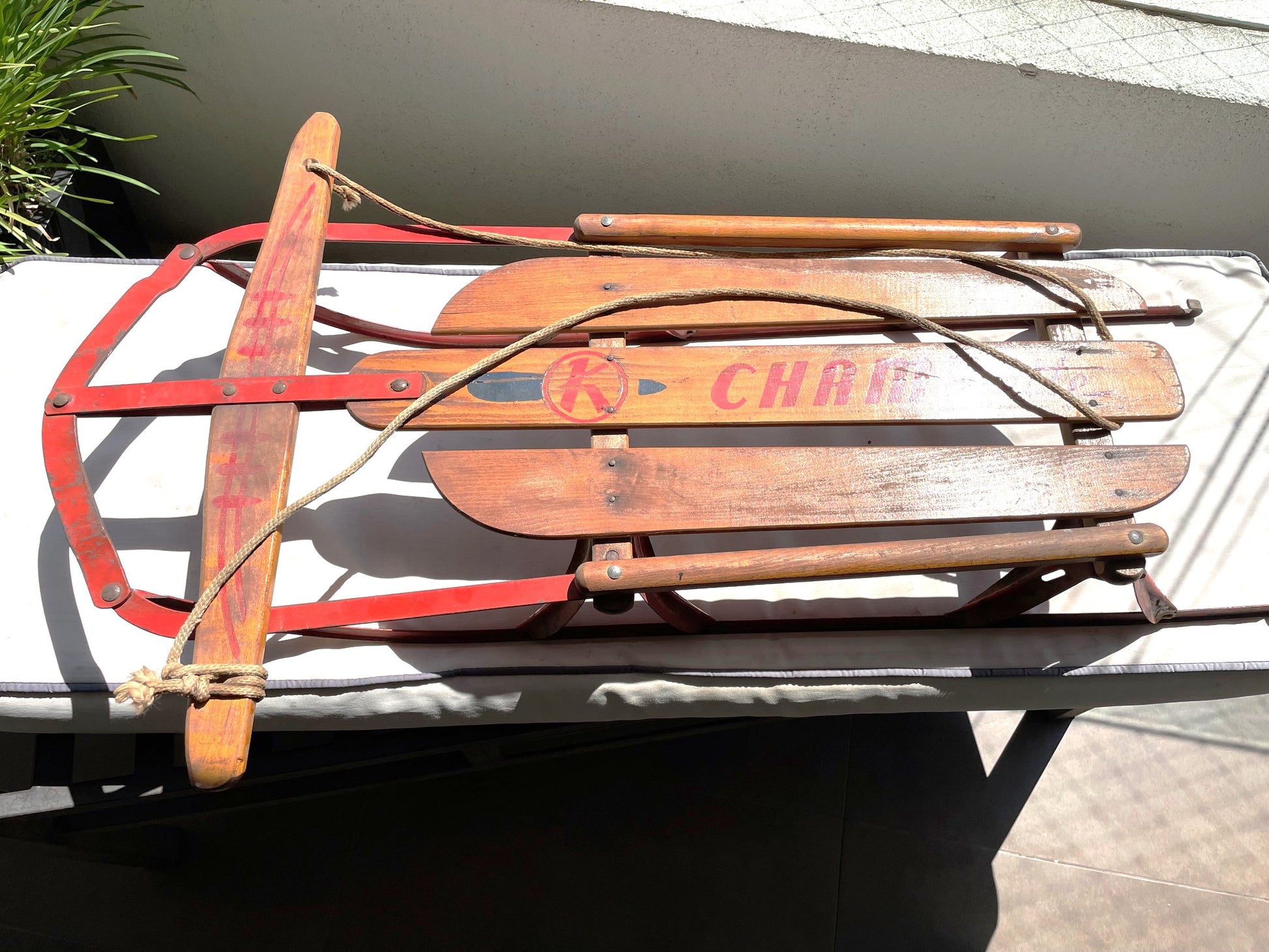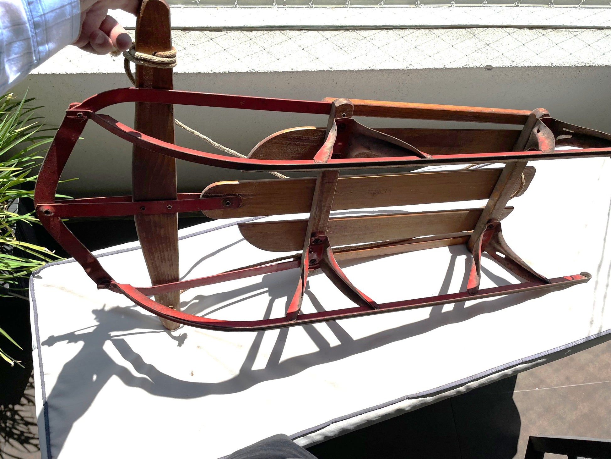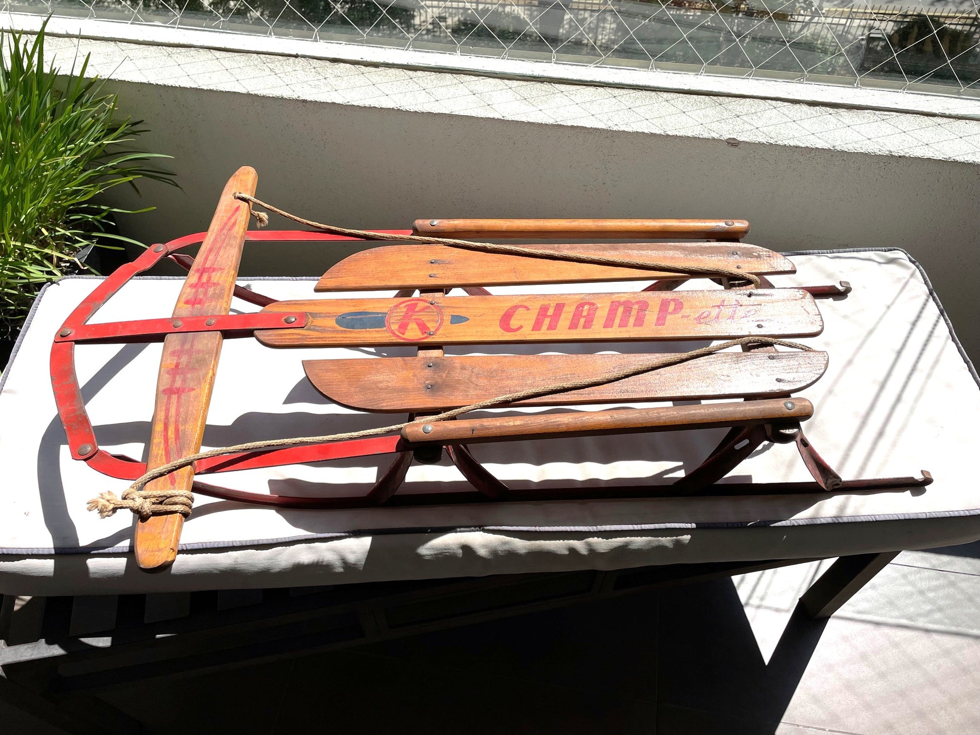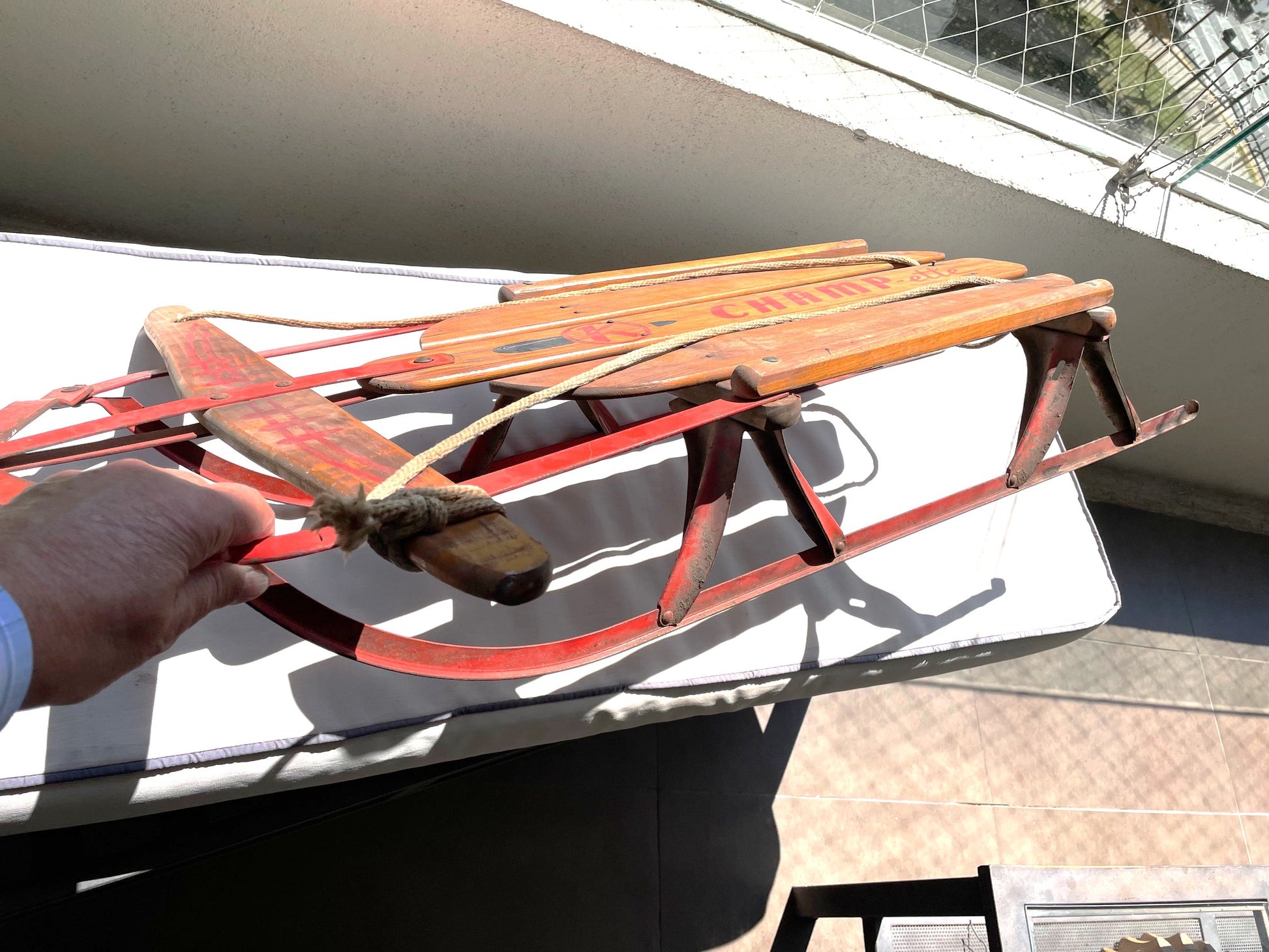 Precioso trineo antiguo de madera y metal marca Champ en buen estado, super decorativo. Las dimensiones soN largo 100 cm, ancho 56 cm y alto 17 cm.