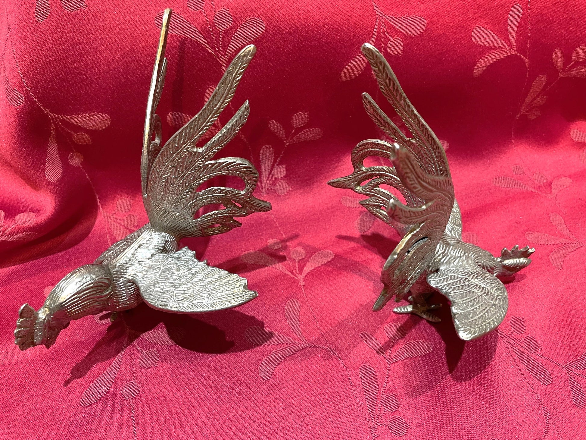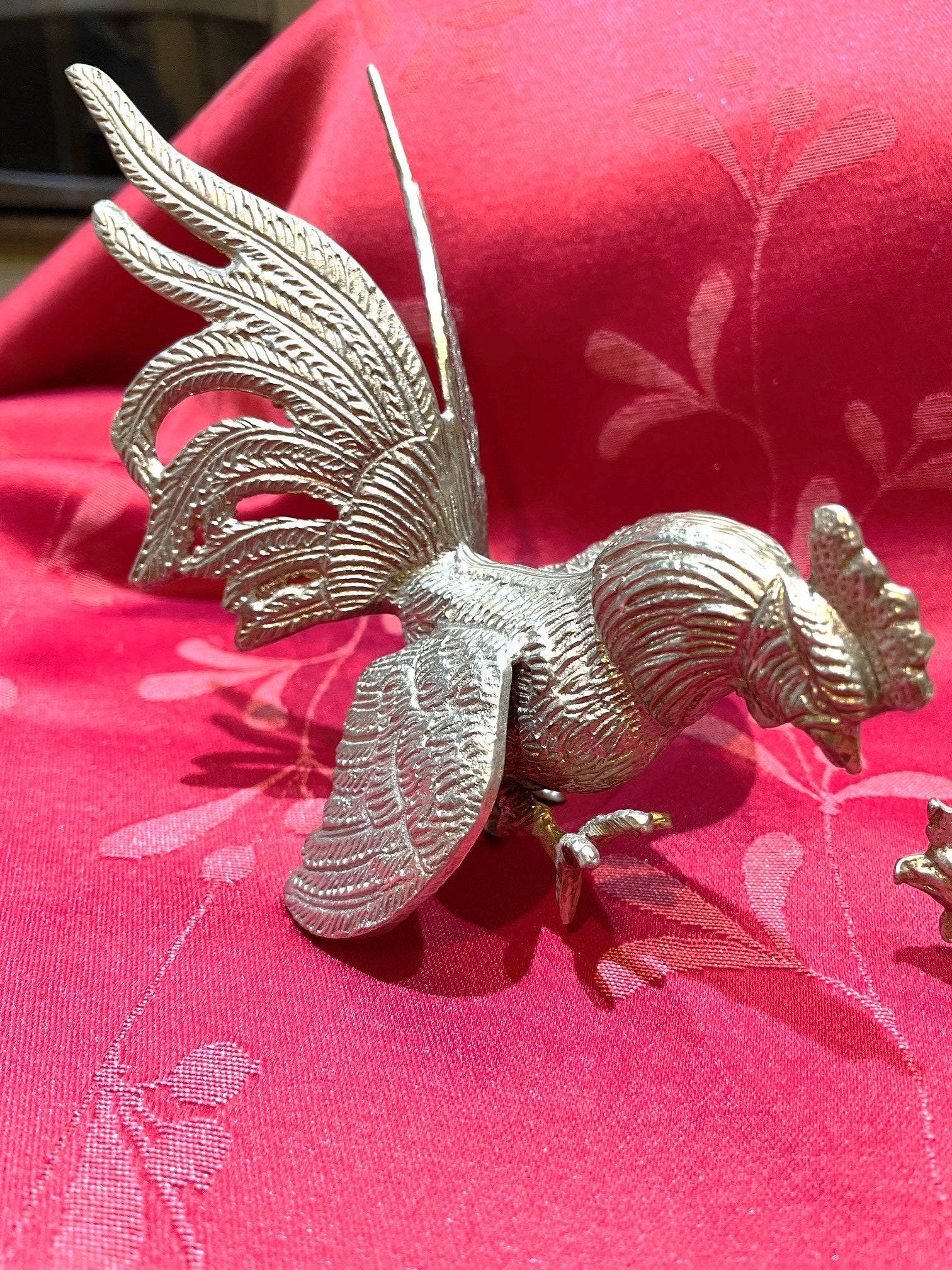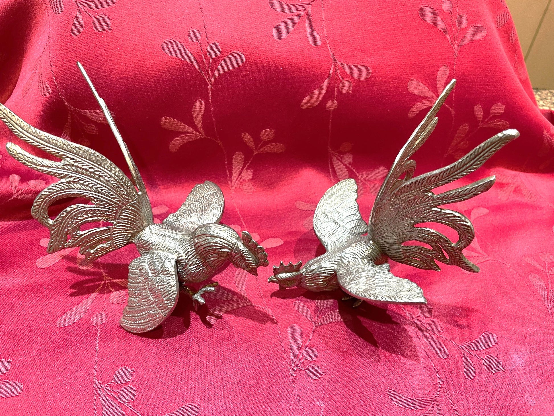 Par de adornos de gallos de pelea plateados made in Italy super decorativos en buen estado. . Miden 14 cm de alto,