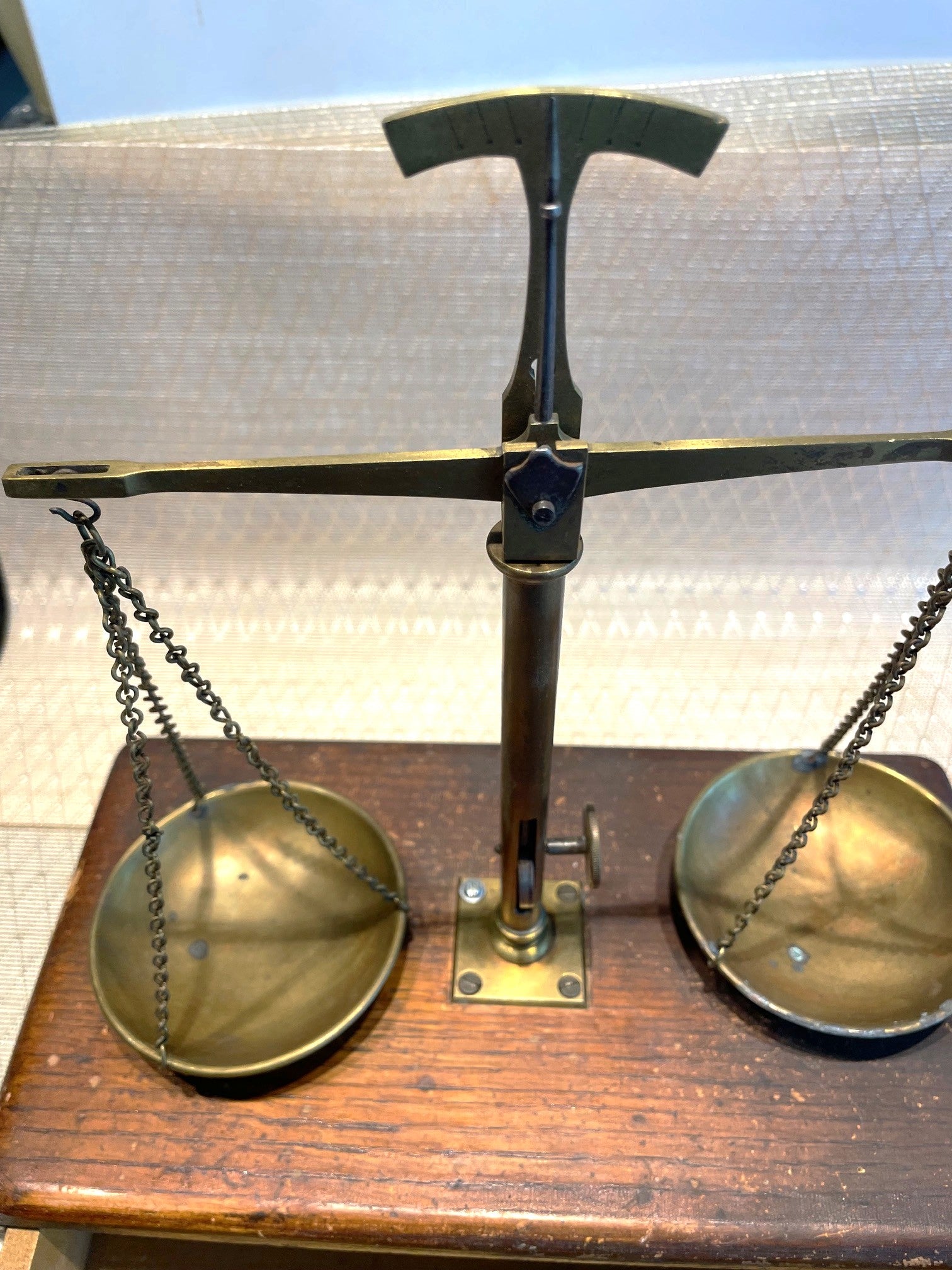 Antiquísima Pesa o balanza de bronce y madera. Funciona perfectamente. Esta en buen estado con sus pesas originales, super decorativa. Mide 26 cm de frente y 30 cm de alto
