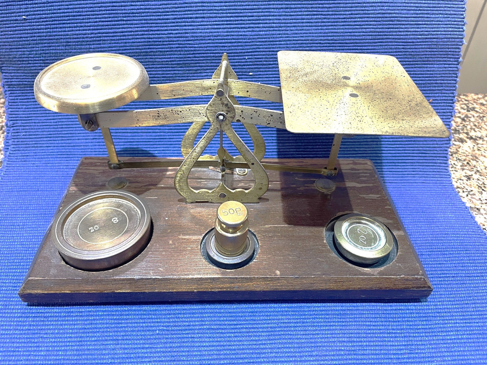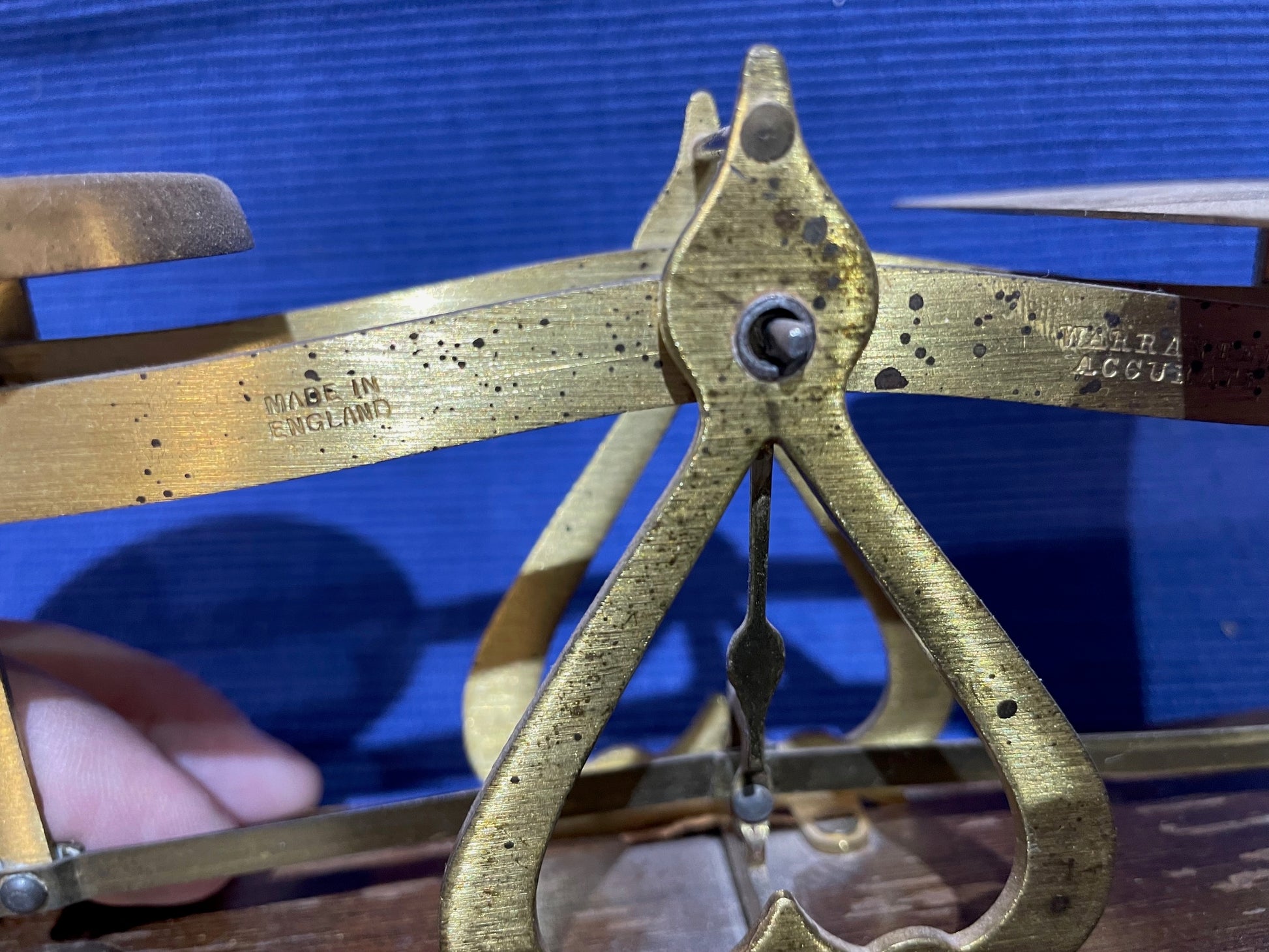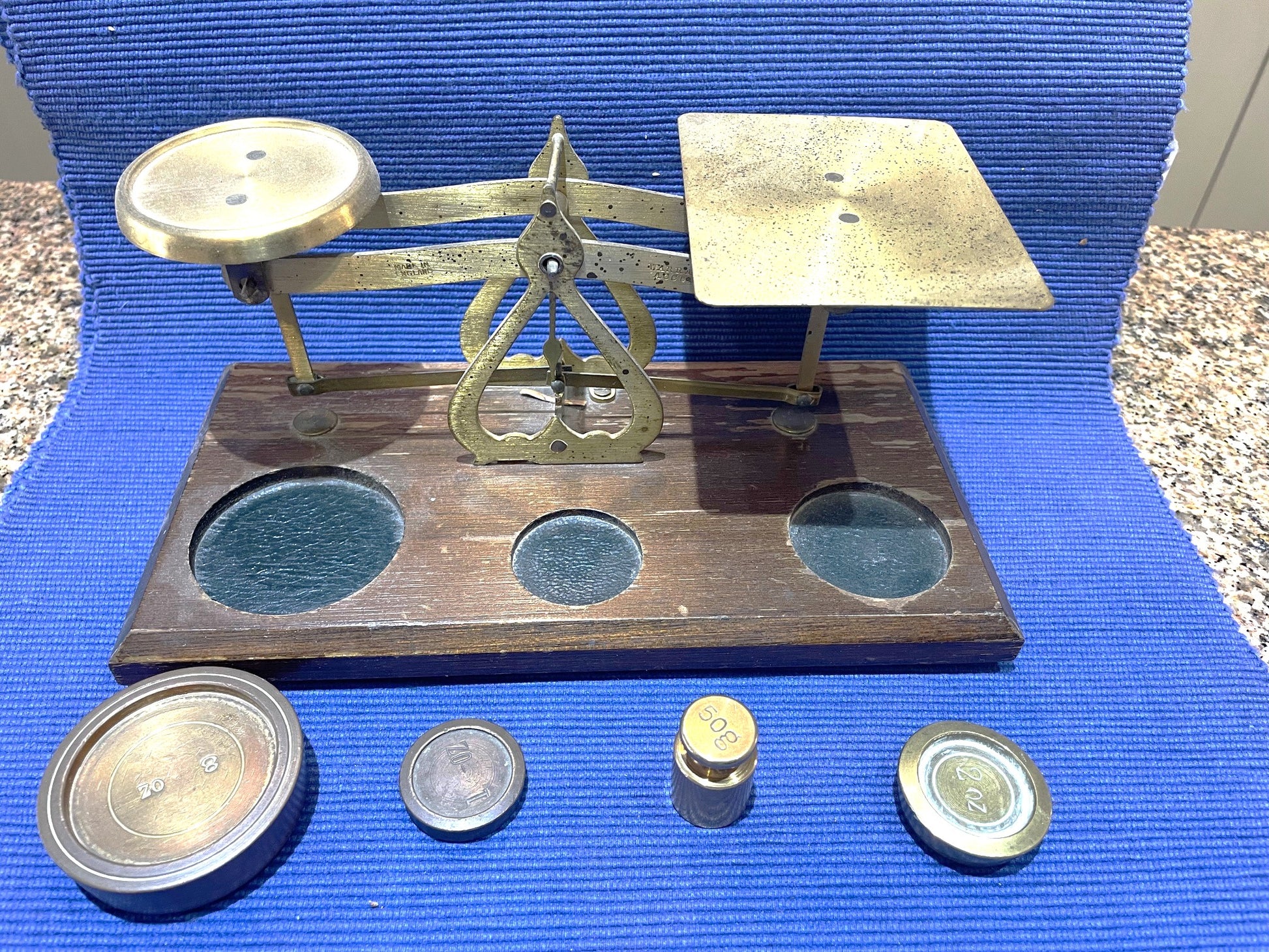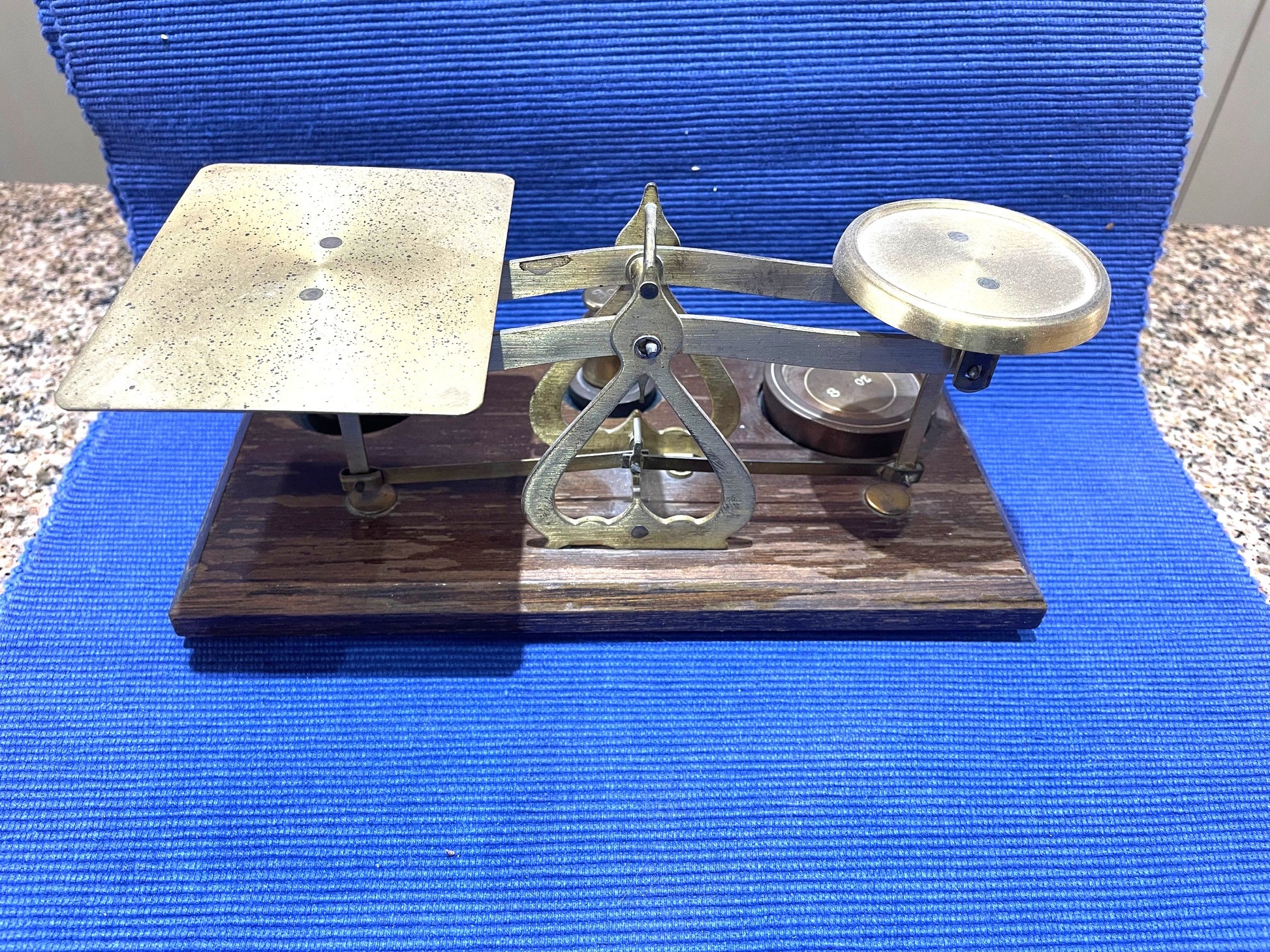 Pesa o Balanza Postal De Madera Y Bronce Inglesa 4 Pesas